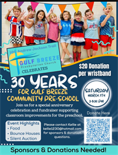 Gulf Breeze Presbyterian Church will host a 30 Year Anniversary Celebration Fundraiser for the Gulf Breeze Community Pre-School on Saturday, March 7th at 100 Andrew Jackson Trail. The event will feature Food, Bounce Houses and a Silent Auction. Sponsors and Donations are encouraged to contact Kellie Gless at kellie1230@hotmail.com. Bring your kids for a lively afternoon of fun and to see what you can win.