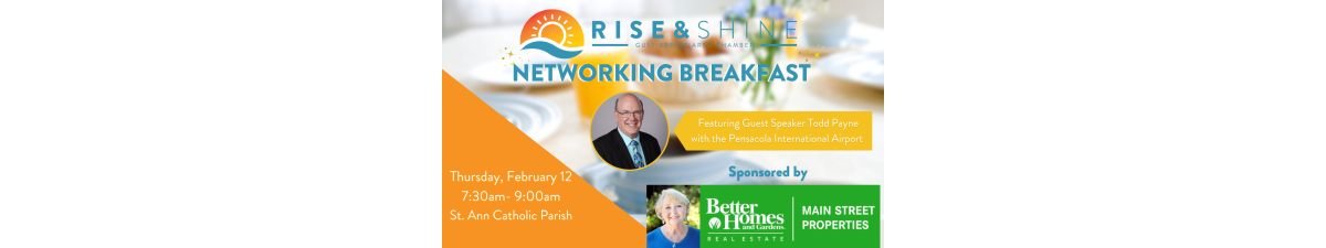 Start your morning with networking, learning, and a wonderful hot breakfast! Join us for our Rise & Shine networking breakfast on Thursday February 12th. Our guest speaker will be Todd Payne with the Pensacola International Airport. Our sponsor is Karen Schwan with Better Homes and Gardens.