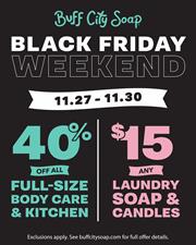 Offer valid 11/27-11/30. Exclusions apply. Details: https://www.buffcitysoap.com
