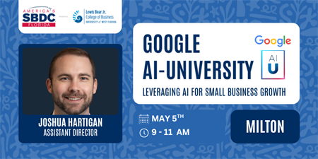 Join us for Google AI University, a special "Lunch & Learn" workshop designed specifically for small business owners, funded in part by Google, and delivered by an ASBDC AI certified trainer. This is your opportunity to understand the foundational concepts of AI and learn practical, actionable ways to implement it into your business today.